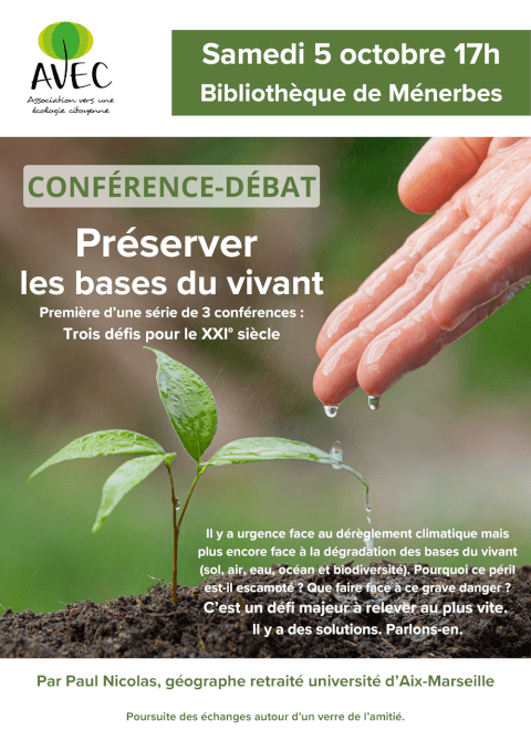 Face à la dégradation des bases du vivant (sol, air, eau, océan et biodiversité), que faire ? Première d’une série de 3 conférences intitulée trois défis pour le XXI siècle, cette première conférence s’inscrit dans la thématique de Vivant ! puisque son objet est de réfléchir à la préservation des bases du vivant. En effet, s’il y a urgence face au dérèglement climatique, le péril est plus grave encore concernant la dégradation des bases du vivant (sol, air, eau, océan et biodiversité). Pourquoi ce péril est-il escamoté ? Que faire face à ce grave danger. C’est un défi majeur à relever au plus vite. Il y a des solutions. Parlons-en. Infos pratiques: Pour lycéens, étudiants, adultes. Pas de réservation. Contact : Paul Nicolas, paelnic@wanadoo.fr, 06 84 09 52 32 ; Monique Aubert, moniqueaubert@orange.fr, 06 32 77 50 67. Foyer rural de Ménerbes.