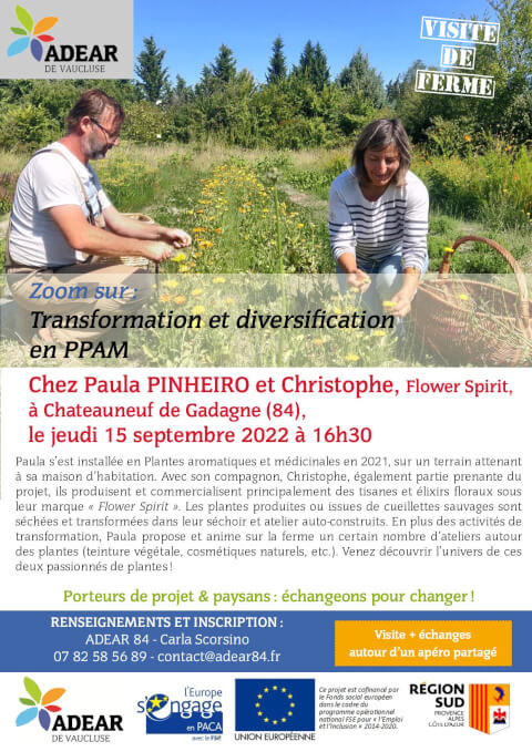 Visite de ferme et apéritif partagé autour de l’installation agricole progressive en PPAM. Infos : 07 82 58 56 89 Paula s’est installée en plantes aromatiques et médicinales en 2021, sur un terrain attenant à sa maison d’habitation. Avec son compagnon, ils produisent et commercialisent principalement des tisanes et élixirs floraux sous leur marque « Flower Spirit ». Les plantes produites ou issues de cueillettes sauvages sont séchées et transformées dans leur séchoir et atelier auto-construits. En plus des activités de transformation, Paula propose et anime sur la ferme un certain nombre d’ateliers autour des plantes (teinture végétale, cosmétiques naturels, etc.). Venez découvrir l’univers de ces deux passionnés de plantes ! CONTACTS www.adear84.fr / 07 82 58 56 89 / contact@adear84.fr › Ferme de Paula Pinheiro