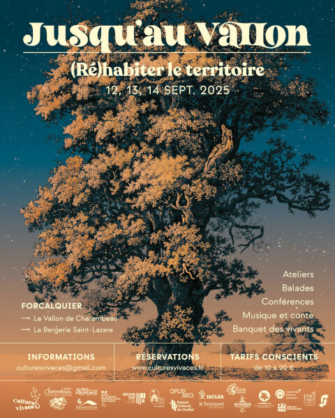 Une programmation riche et diversifiée, mêlant art, science, agriculture et écologie pour repenser notre rapport au monde, envisagé comme une condition préalable indispensable au déploiement des transitions agricole, alimentaire et écologique sur les territoires. Trois jours d'ateliers, balades, et conférences avec notamment Alain Damasio, Marc-André Sélosse ou Véronique Mure et la participation du trio musical Christine Zayed -Sylvain Barou- Habib Meftah Et pour finir, le Banquet des Vivants, une proposition artistique, culinaire et conviviale orchestrée par la cheffe Kim Ardavin pour réveiller les papilles. 2 lieux : La Bergerie St-Lazare - 427 chemin de Billebaude - 04300 Forcalquier et Le Vallon (site de Charembeau) - 1734 chemin du milieu - 04300 Forcalquier Organisateurs : Cultures Vivaces, avec le soutien d’Au Maquis Public familial Informations : www.culturesvivaces.fr Lien vers programme PDF : https://online.fliphtml5.com/eccur/wkwn/#p=1 Réservation conseillée pour l'ensemble du festival et indispensable pour le Banquet, les ateliers et balades. Billetterie : https://www.helloasso.com/associations/cultures-vivaces/evenements/festival-jusqu-au-vallon-2025-1