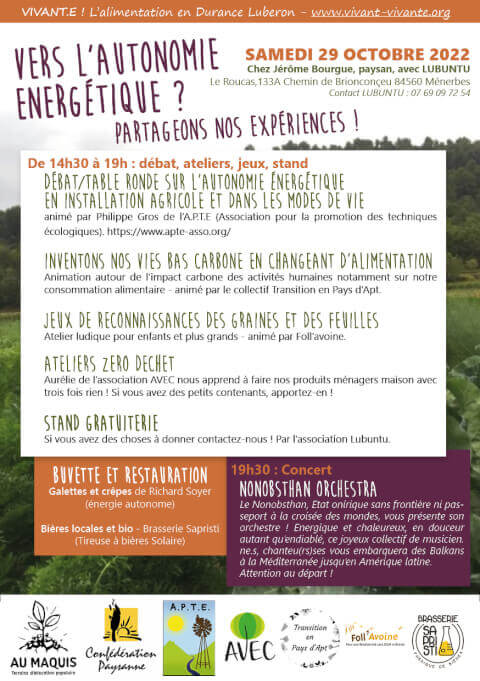 "Imagine demain y 'a plus d'électricité, que fait-on ?" Découvrez des paysans et autres intervenants qui pratiquent l'autonomie énergétique pour sortir de la dépendance au pétrole de 14h30 à 19h : - Débats/table ronde sur l'Autonomie énergétique en installation agricole et dans les modes de vie animé par Philippe de l'A.P.T.E (Association pour la promotion des techniques écologiques). https://www.apte-asso.org/ Vous serez tous.tes les bienvenu·es pour partager vos expériences ! - Animation autour de l'impact carbone des activités humaines notamment sur notre consommation alimentaire - animé par le collectif Transition en Pays d'Apt - Ateliers ludiques pour enfants et plus grands. Jeux de reconnaissances des graines et des feuilles animé par Foll'avoine. - Ateliers Zéro Déchet. Aurélie (de l'association AVEC) nous apprend à faire nos produits ménagers maison avec trois fois rien. Ramenez simplement un petit contenant en verre si vous avez ! Buvette et restauration : - Richard Soyer vous préparera des galettes de saison et véganes. Energie Autonome - La brasserie Sapristi (artisans brasseurs bio et local) met à disposition sa tireuse à bière solaire. à partir de 19h30 : Concert avec les Nonobsthan Orchestra ! Infos : 07 69 09 72 54 06 77 80 69 42 › Ferme de Jérôme Bourgue, Le Roucas, 133A Chemin de Brionçonceu